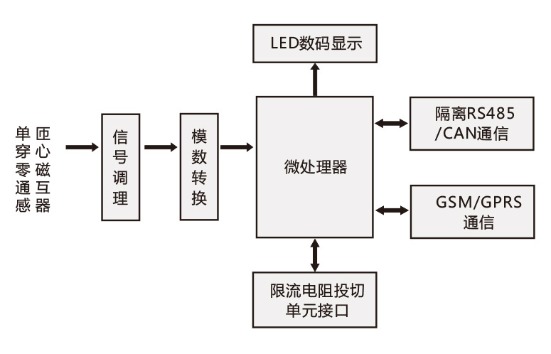變壓器鐵芯接地電流通過穿心式電流互感器隔離變換為小信號,經(jīng)信號轉(zhuǎn)換、濾波與放大等調(diào)理電路,由模數(shù)轉(zhuǎn)換器變換為數(shù)字信號,微處理器經(jīng)過數(shù)字濾波與運(yùn)算獲得鐵芯接地電流;本地顯示接口可顯示實(shí)時(shí)接地電流,當(dāng)超過報(bào)警限值時(shí)具有LED指示; 裝置可通過隔離RS485/CAN/GSM/GPRS通信接口(訂貨時(shí)選擇)與狀態(tài)監(jiān)測系統(tǒng)等后臺實(shí)時(shí)通信。裝置具有限流電阻投切控制單元接口,當(dāng)電流超過設(shè)定限值時(shí)自動逐檔投入限流電阻(4檔阻值)以降低接地電流作為應(yīng)急措施 ,電流低于限值時(shí)自動切除限流電阻。