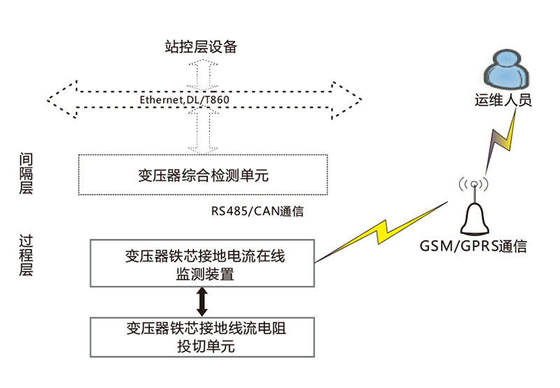 變壓器鐵芯接地電流在線監(jiān)測裝置可適應(yīng)各種環(huán)境條件下對變壓器進(jìn)行監(jiān)測,根據(jù)不同的應(yīng)用需求,裝置可配置為接入變電設(shè)備綜合狀態(tài)監(jiān)測系統(tǒng)、獨(dú)立GSM短信實(shí)現(xiàn)監(jiān)測、或兩者結(jié)合應(yīng)用應(yīng)用示意如圖:
